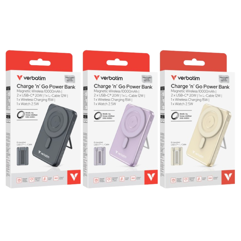 Verbatim Charge 'n' Go Power Bank Magnetic Wireless Charging 10000mAh 5-in-1 Stand 磁吸無線流動充電池 32221 / 32222 / 32233